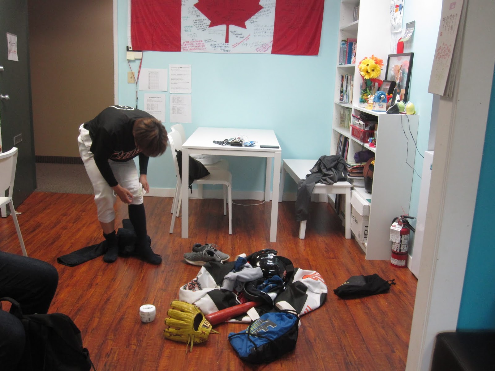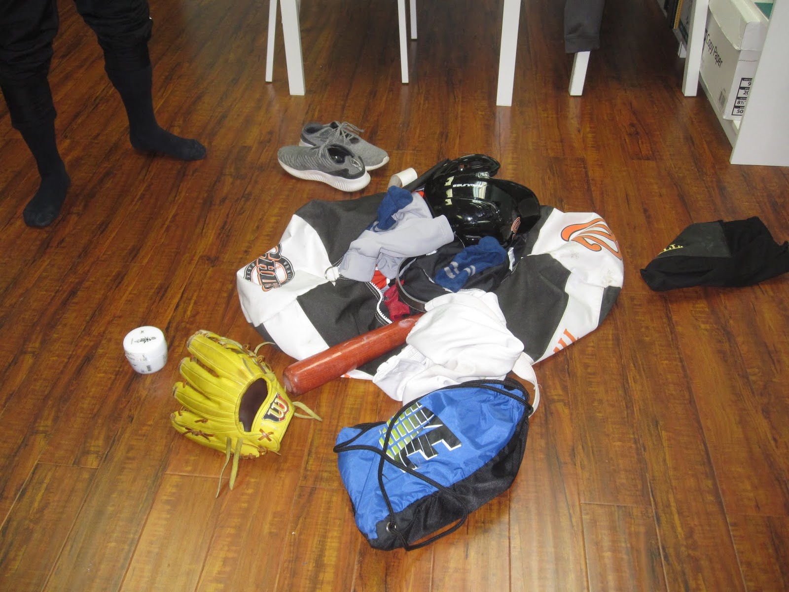 誰の部屋2 放課後。 野球の練習に行くT君。 集合15分前。まだオフィスにいるT君。ホームグラウンドだからと言って余裕をしていた彼。あわてて着替え始めたけど、またまた誰の部屋状態になったオフィスの床・・・